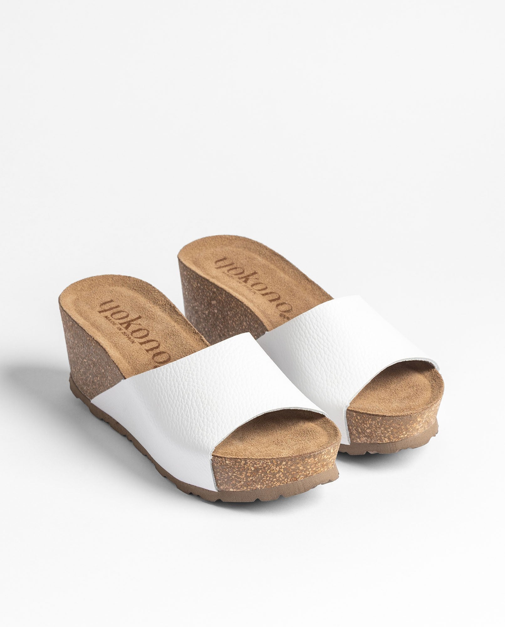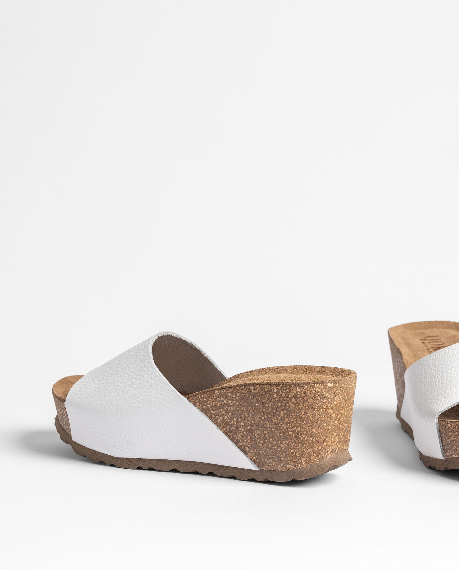 The wedge sandal BARI 265 in white is crafted from 100% cowhide leather and embraces a minimalist design with a wide front strap that adds style and ensures an especially comfortable fit. Its anatomical footbed and lightweight wedge made from sustainable natural cork —with thermal-regulating properties— provide natural, all-day comfort. Produced in collaboration with local suppliers, it is a versatile, comfortable, and responsible option for everyday wear.