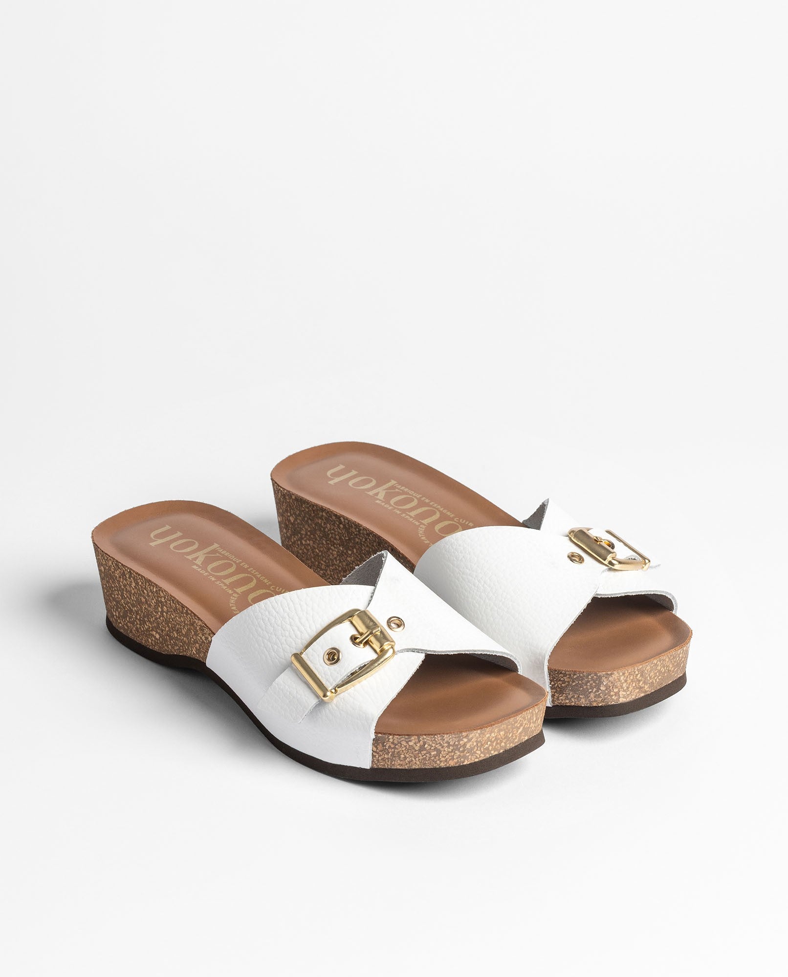 The wedge sandal BOGO 260 in white is crafted from cowhide leather and features a front strap with a decorative buckle that adds a clean, contemporary look that’s easy to pair with any outfit. Its anatomical footbed, together with the lightweight wedge made from sustainable natural cork —with thermal-regulating properties— provides a fresh and comfortable step. Produced in collaboration with local suppliers, it is a versatile option that brings together quality, comfort, and a design made for everyday wear.