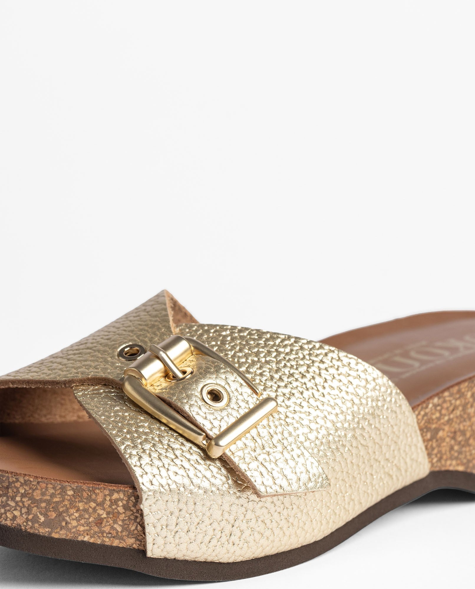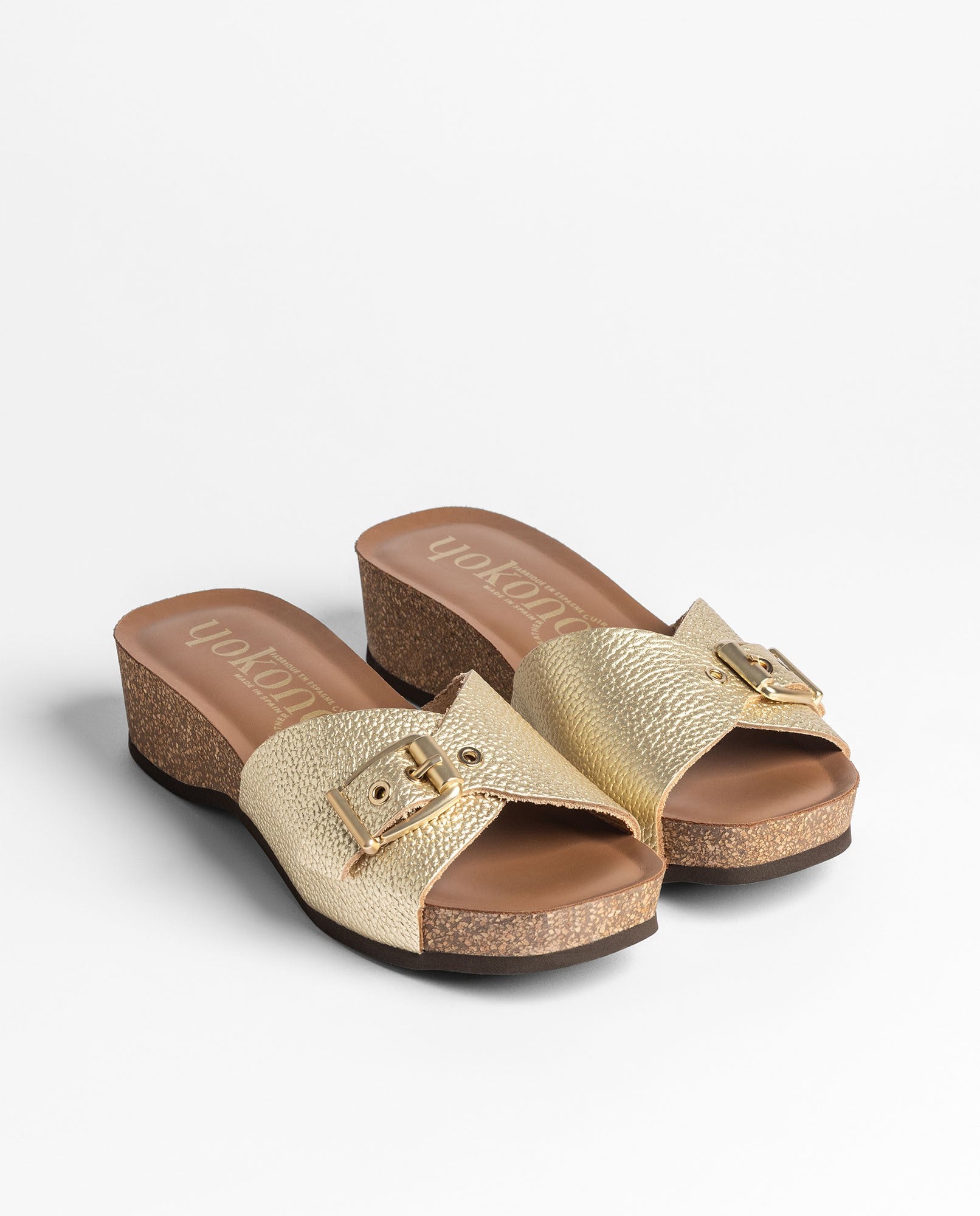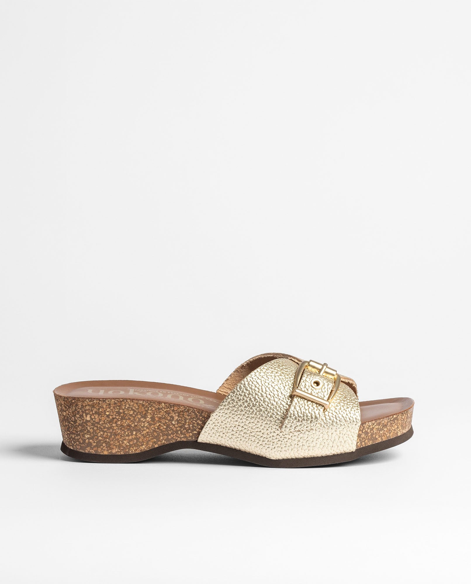 The wedge sandal BOGO 260 in gold is crafted from cowhide leather and features a front strap with a decorative buckle that adds a clean, contemporary look that’s easy to pair with any outfit. Its anatomical footbed, together with the lightweight wedge made from sustainable natural cork —with thermal-regulating properties— provides a fresh and comfortable step. Produced in collaboration with local suppliers, it is a versatile option that brings together quality, comfort, and a design made for everyday wear.