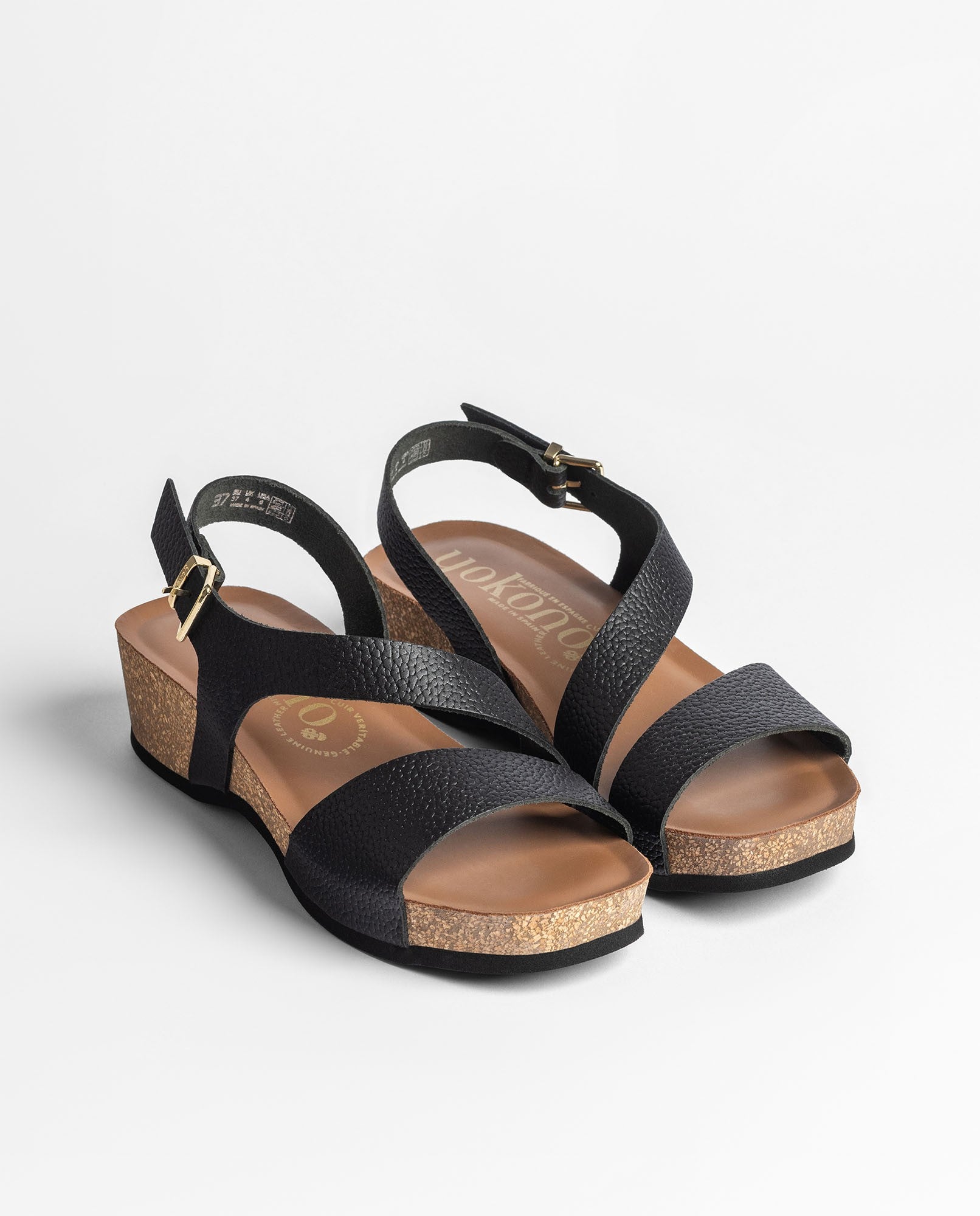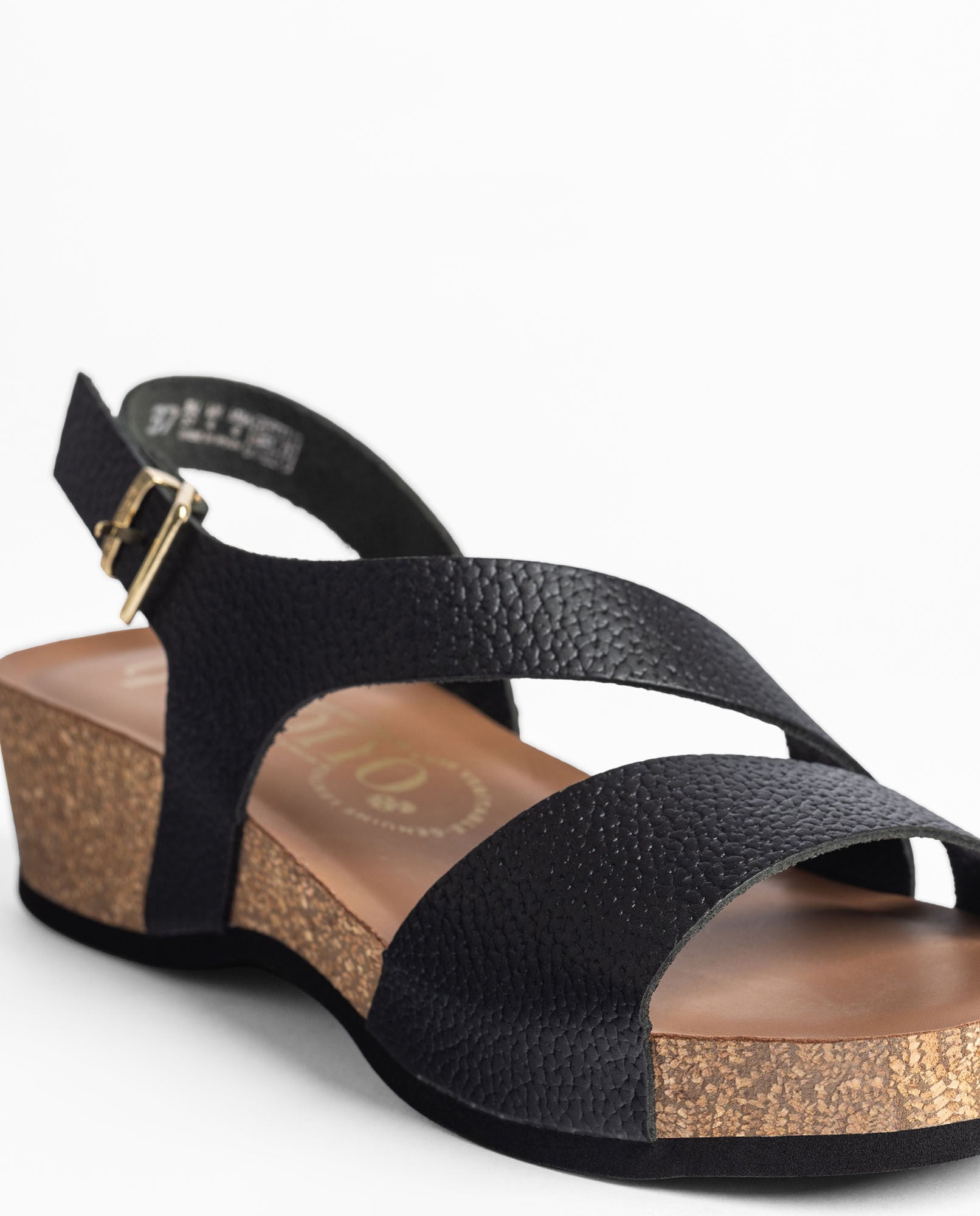 The wedge sandal BOGO 264 in black is crafted from cowhide leather and features a design with a front strap and an adjustable ankle strap, finished with a metallic buckle that adds an elegant, well-defined touch. Its anatomical footbed and lightweight wedge made from sustainable natural cork —with thermal-regulating properties— ensure fresh, pleasant comfort throughout the day. Produced in collaboration with local suppliers, it is an option that combines style, quality, and comfort for everyday wear.