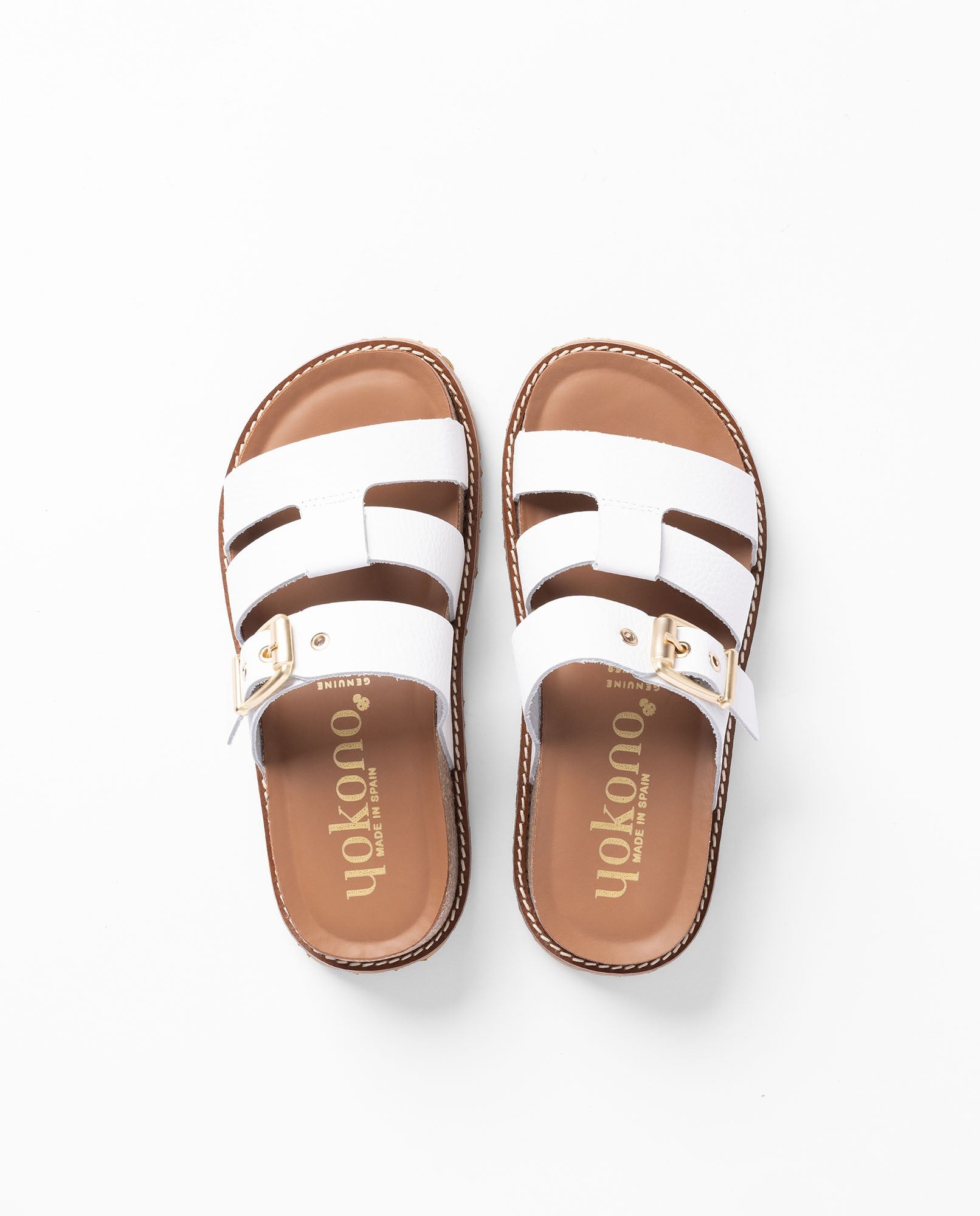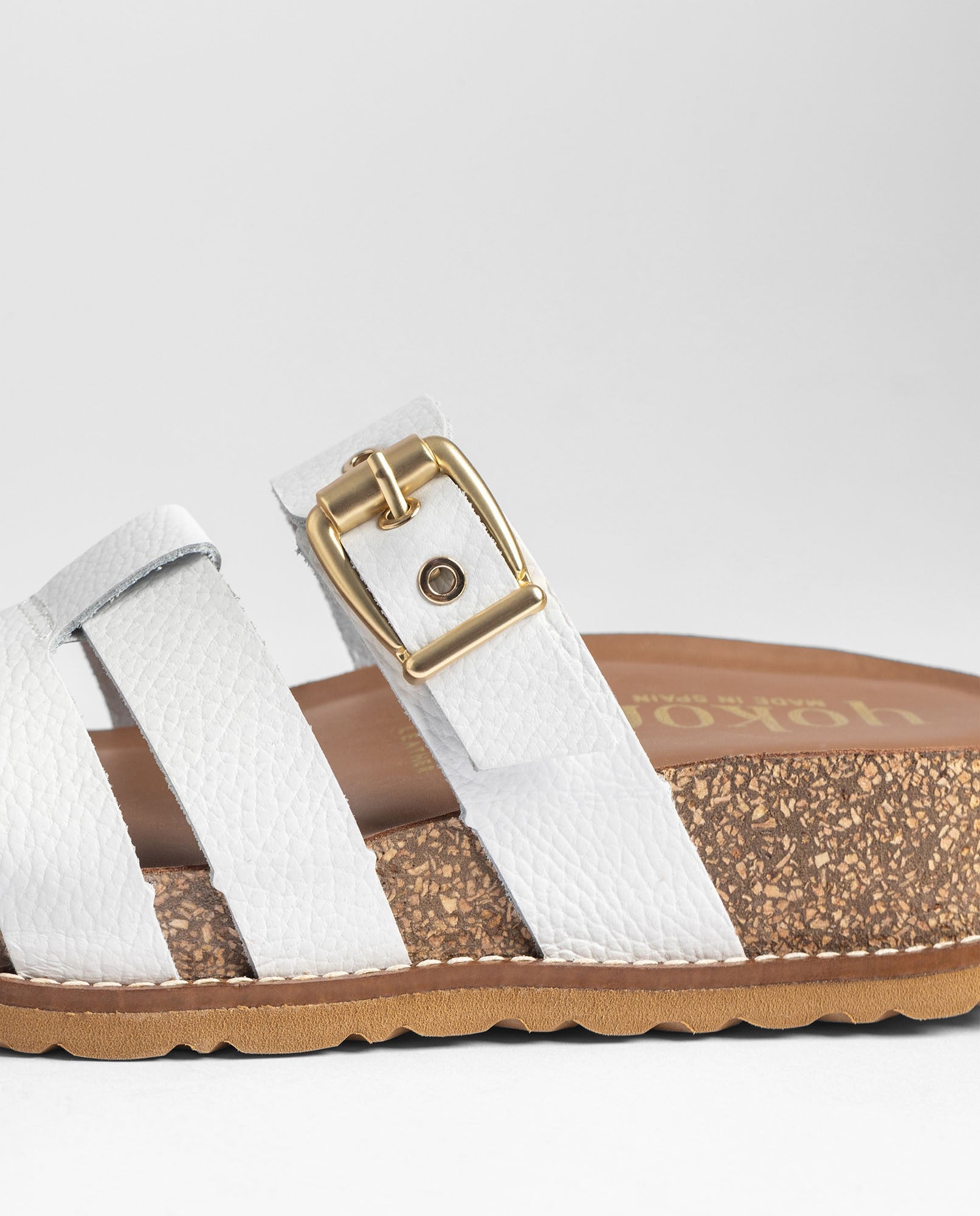 The platform sandal OCA 260 in white is crafted from cowhide leather and features three adjustable buckle straps so you can tailor the fit to your needs. Its anatomical footbed and sustainable cork platform provide a comfortable, stable feel when walking, even on long days. Produced in collaboration with local suppliers, it is a lightweight, functional sandal that fits easily into both casual and more refined looks.