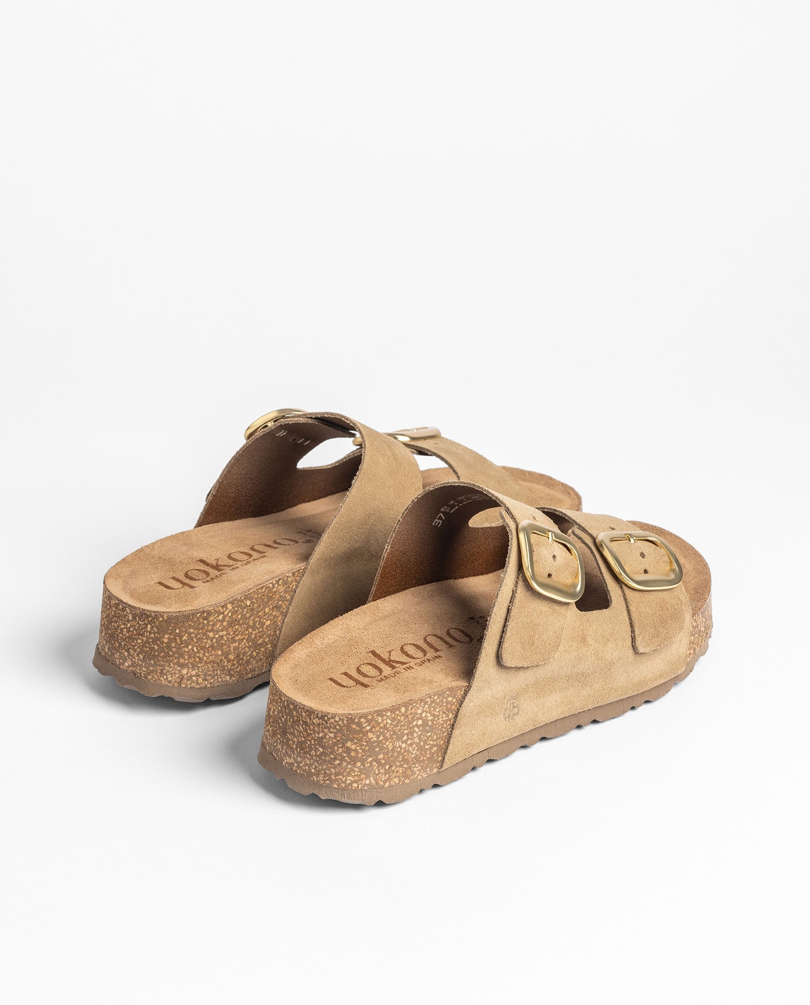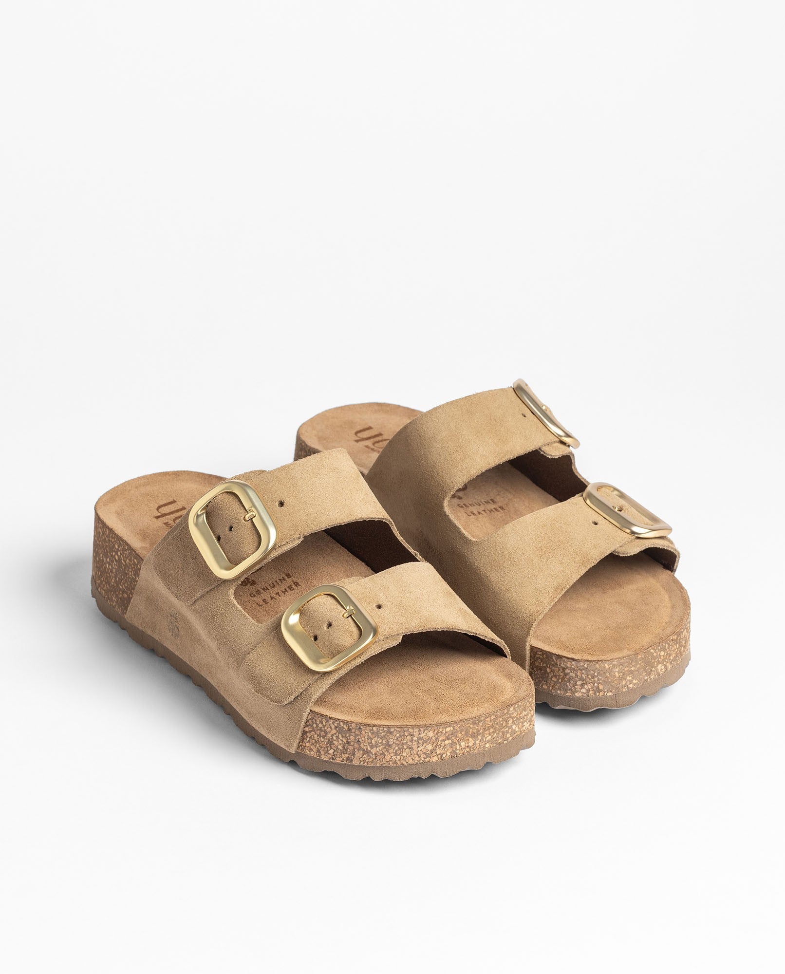 The platform sandal WIWI 003 in light brown combines cowhide leather with two buckles that allow you to adjust the fit while adding a touch of personality. It features an anatomical footbed and a sustainable cork platform —a material that helps keep the foot at a pleasant temperature— to provide a feeling of well-being with every step. Produced in collaboration with local suppliers, it is a lightweight, modern sandal that is very easy to wear in everyday life.