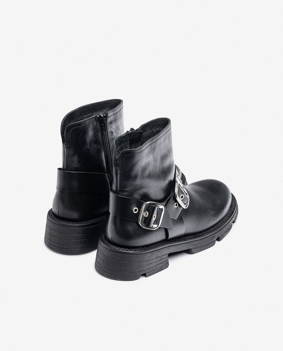 The flat ankle boot ELZE 008 is a model with character, designed to stand out. Its clean silhouette is complemented by a double metal buckle with studs, giving it an urban edge. Crafted from high-quality leather, this design features an inner zipper for quick and easy wear, along with a robust, chunky sole—ideal for stylish everyday use. A versatile, comfortable, and confident choice, made in Spain with meticulous finishes and durable materials.