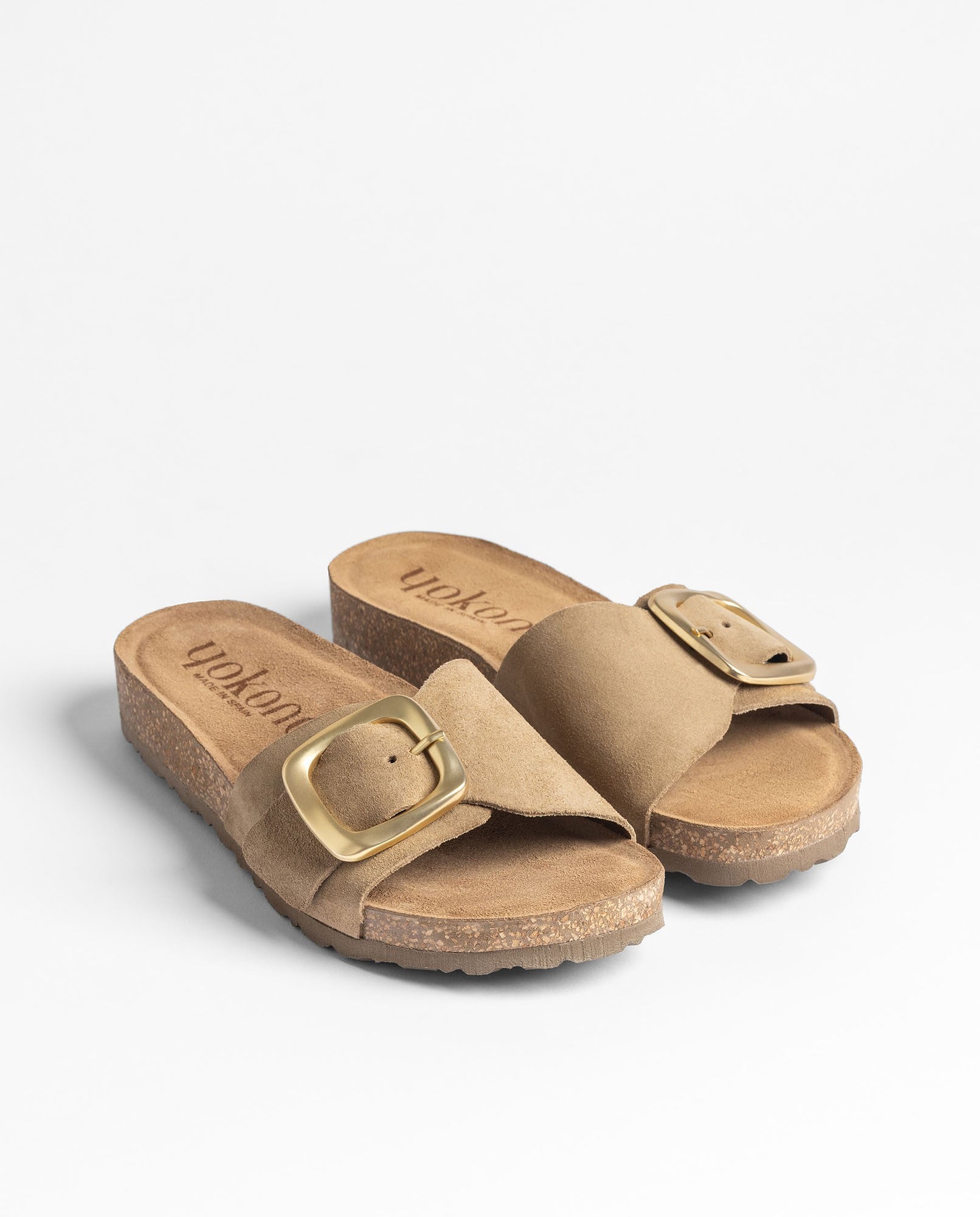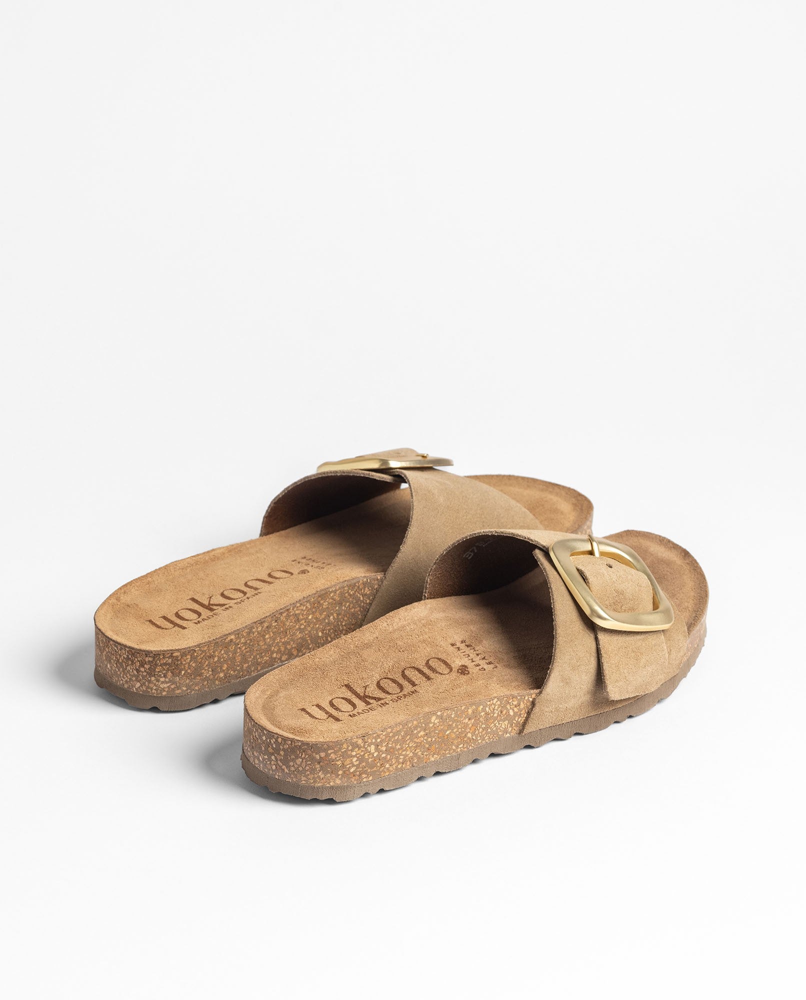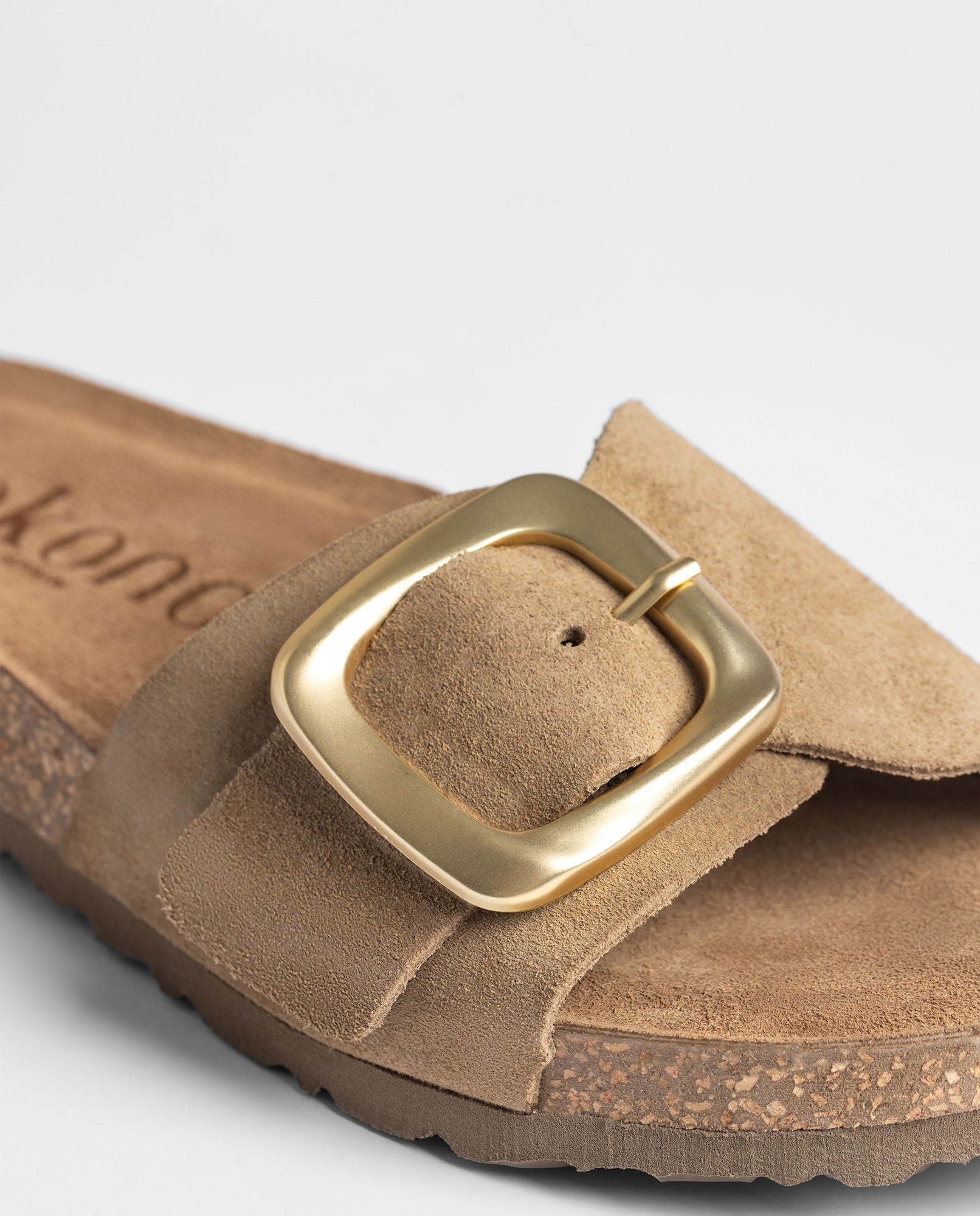 The flat sandal JERBA 114 in light brown is crafted from high-quality cowhide leather and features a wide front strap with an adjustable buckle that adds style and allows the fit to adapt to each foot. Its anatomical footbed provides comfort from the very first step, while the sole made from sustainable natural cork —with thermal-regulating properties— adds an extra level of well-being throughout the entire day. Produced in collaboration with local suppliers, it is a versatile, comfortable sandal designed to accompany you in everyday life with a modern and practical look.