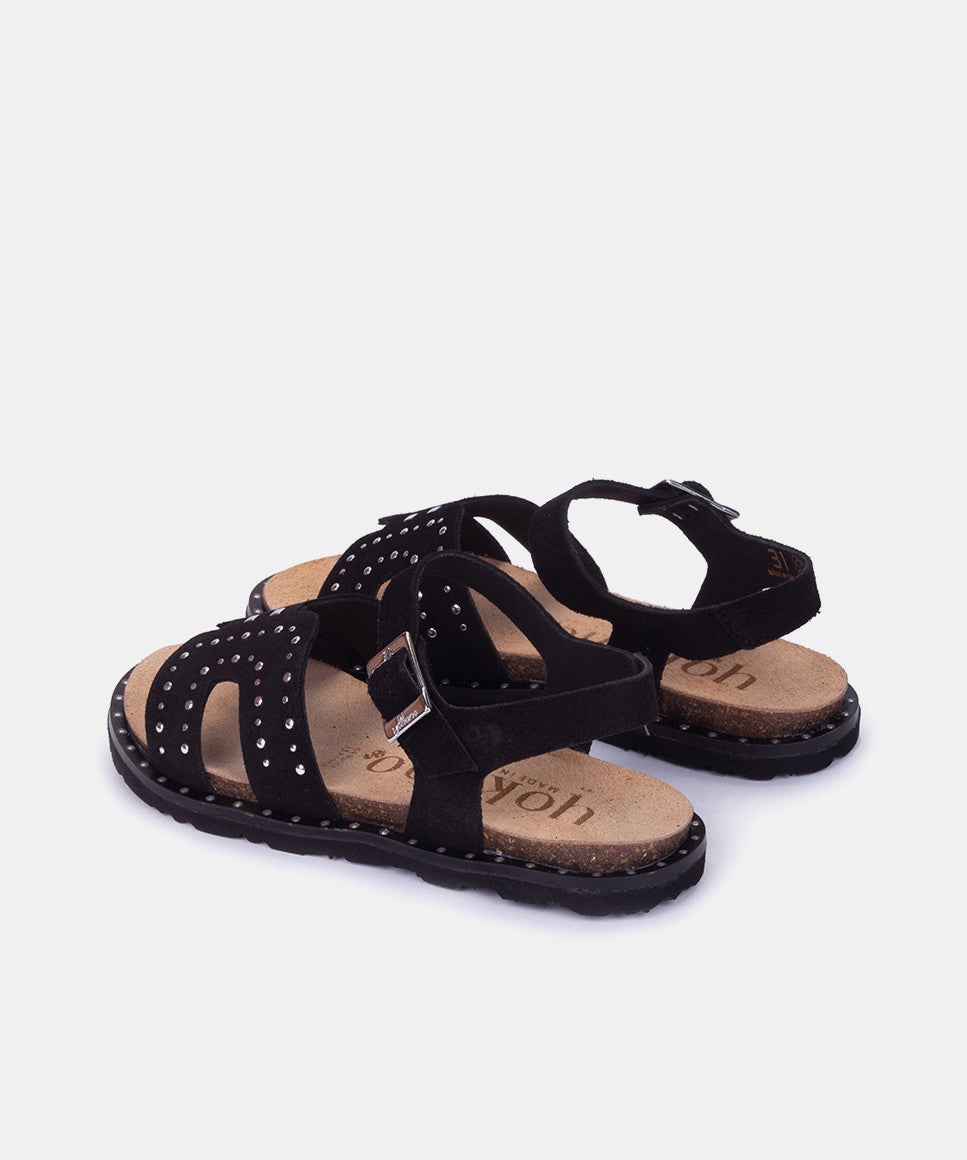 The flat sandal LUSBO 228 blends comfort and style for girls who are always on the move. Made of suede leather, it features an original design with a front panel decorated with geometric cutouts and small metal studs, adding a modern and shiny touch. The rubber lug sole provides excellent grip, ideal for constant play and movement. The adjustable ankle buckle ensures a secure and personalized fit. A sandal full of character, perfect for everyday wear or special occasions.