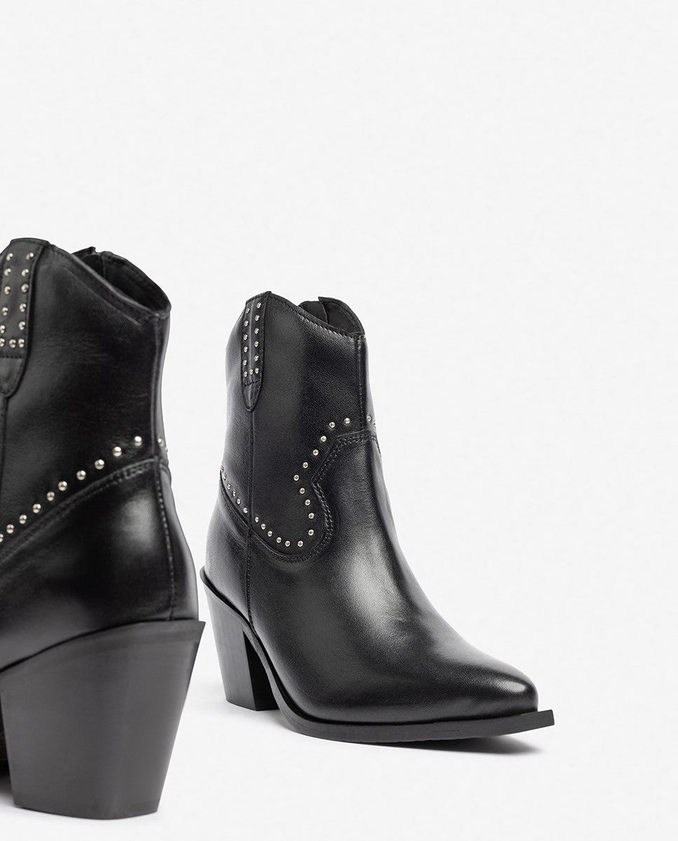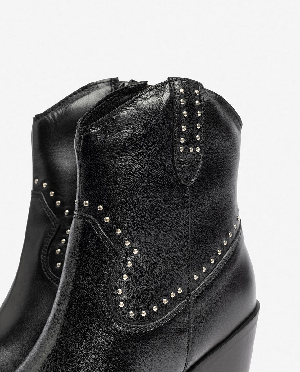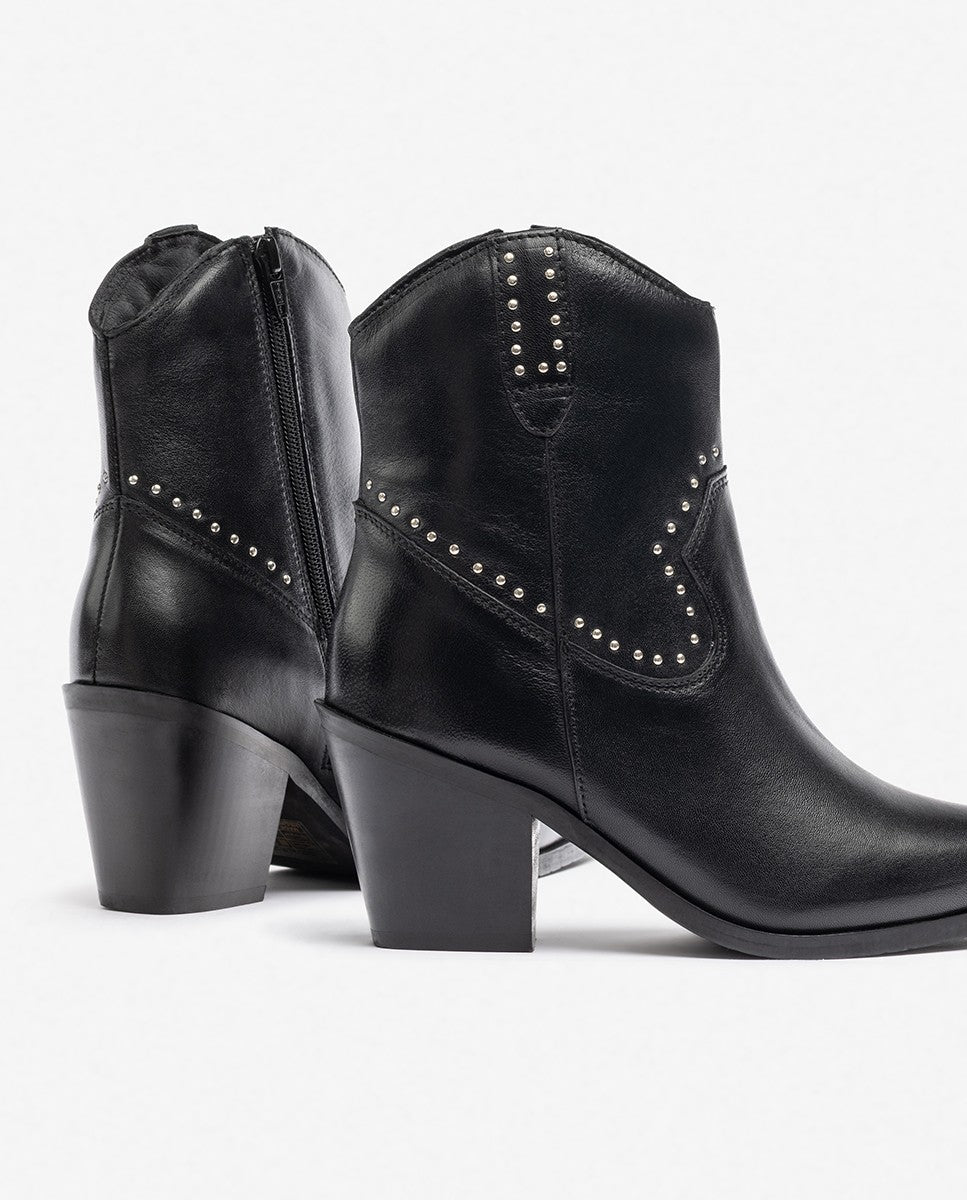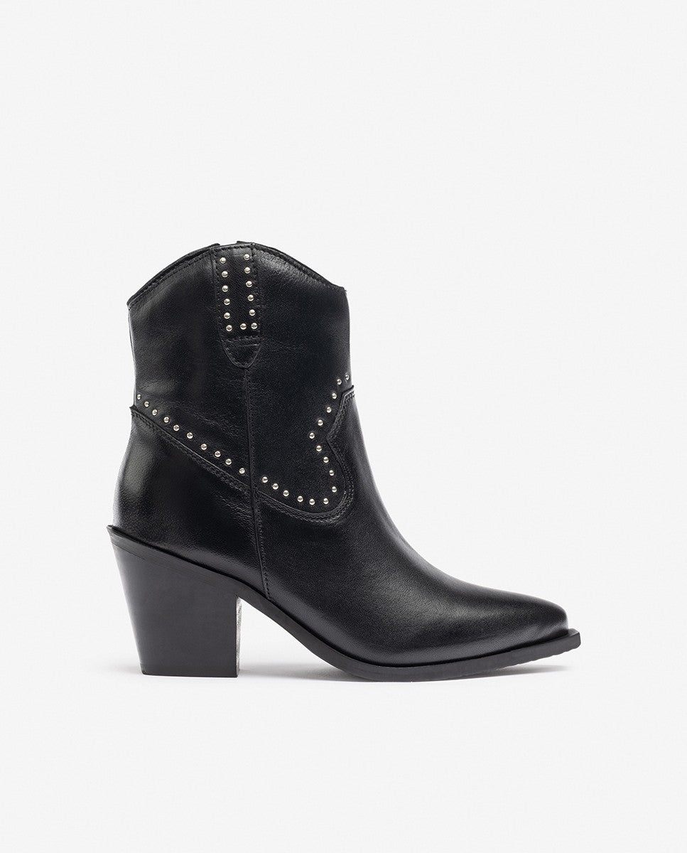 El botín de tacón RID 401 destaca por su diseño de inspiración western, con detalles metálicos decorativos que aportan carácter y originalidad. Su puntera afilada, tacón ancho de 6 cm y cremallera interior la convierten en una opción cómoda y sofisticada para quienes buscan estilo con personalidad. Confeccionada en piel de alta calidad.
