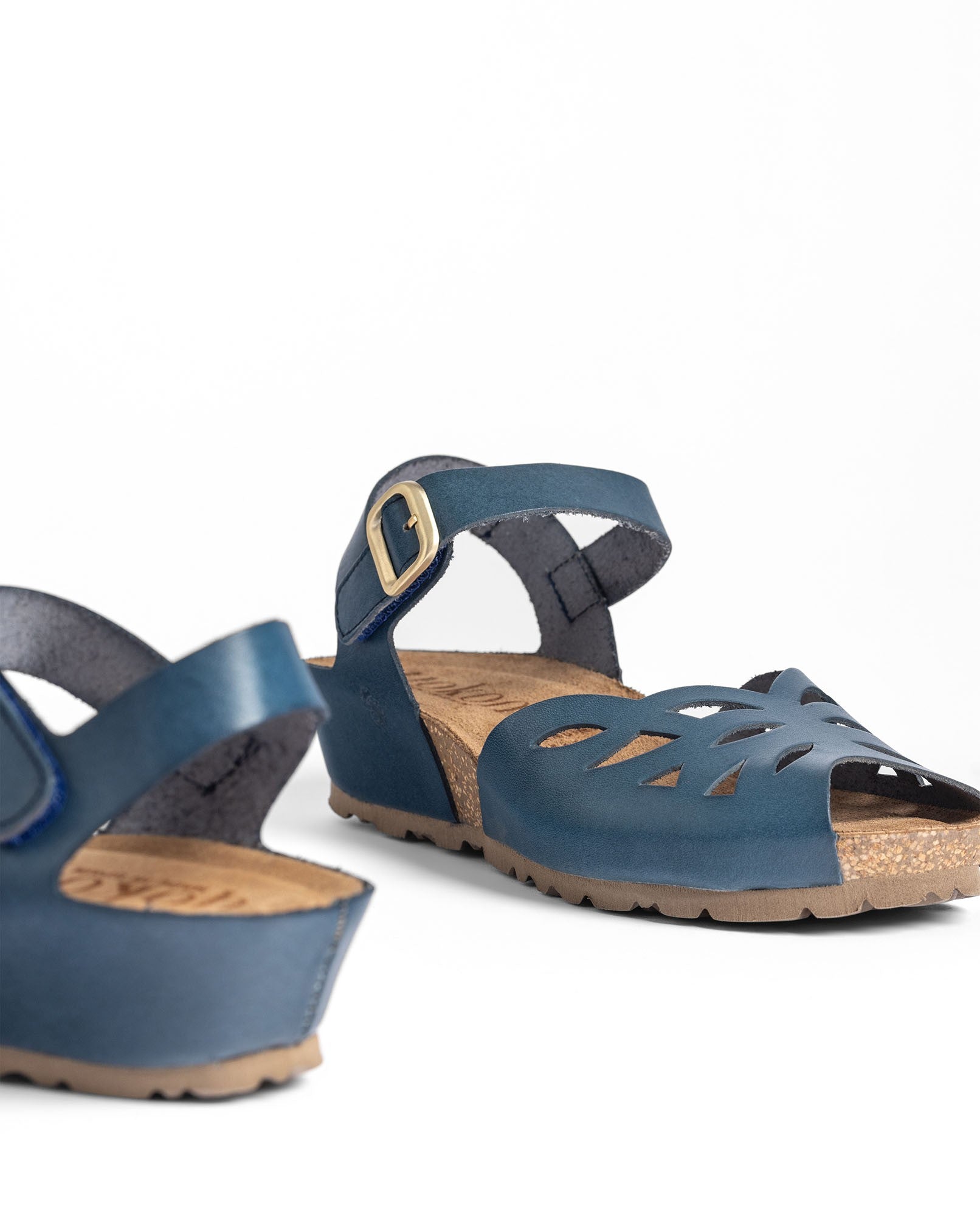 La sandalia de cuña MONACO 003 en color azul es uno de los modelos más reconocibles de la colección, con su diseño abierto y ese estilo que nunca pasa de moda. Está elaborada en piel y trabajada de forma artesanal, cuidando cada detalle. Su plantilla anatómica y la base de corcho sostenible —que ayuda a mantener el pie a buena temperatura— aportan comodidad y estabilidad en la pisada. Una cuña versátil y atemporal, pensada para acompañarte temporada tras temporada.