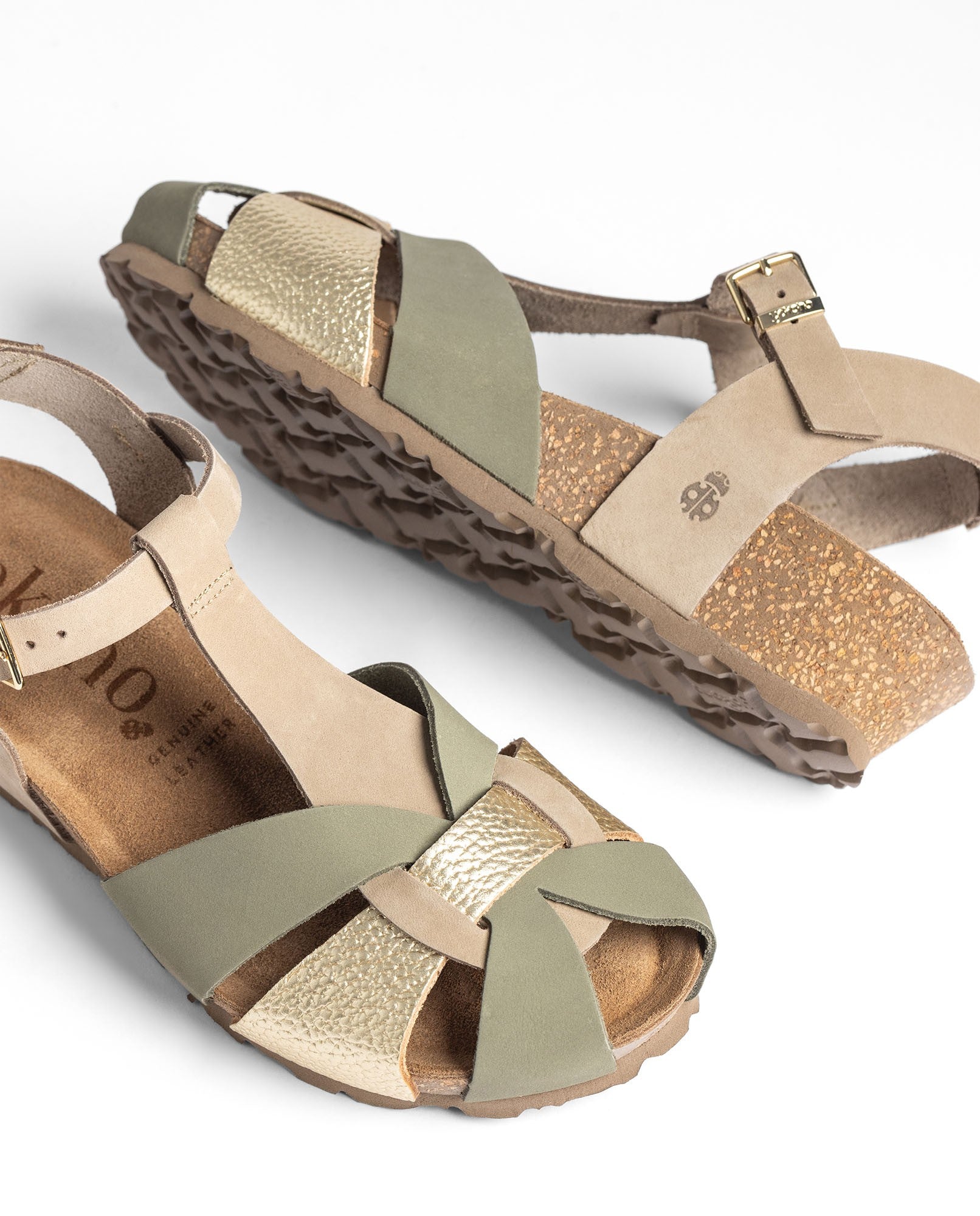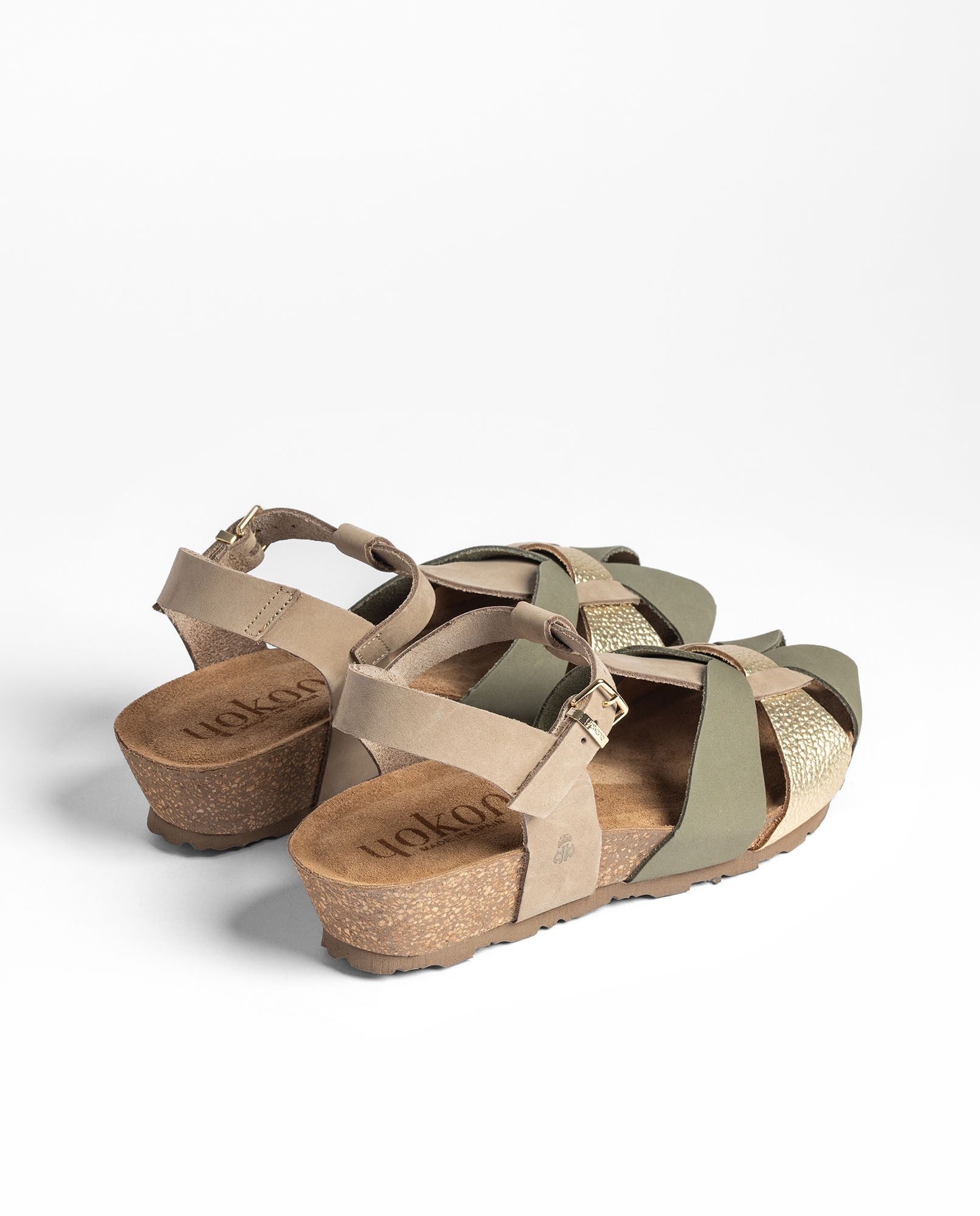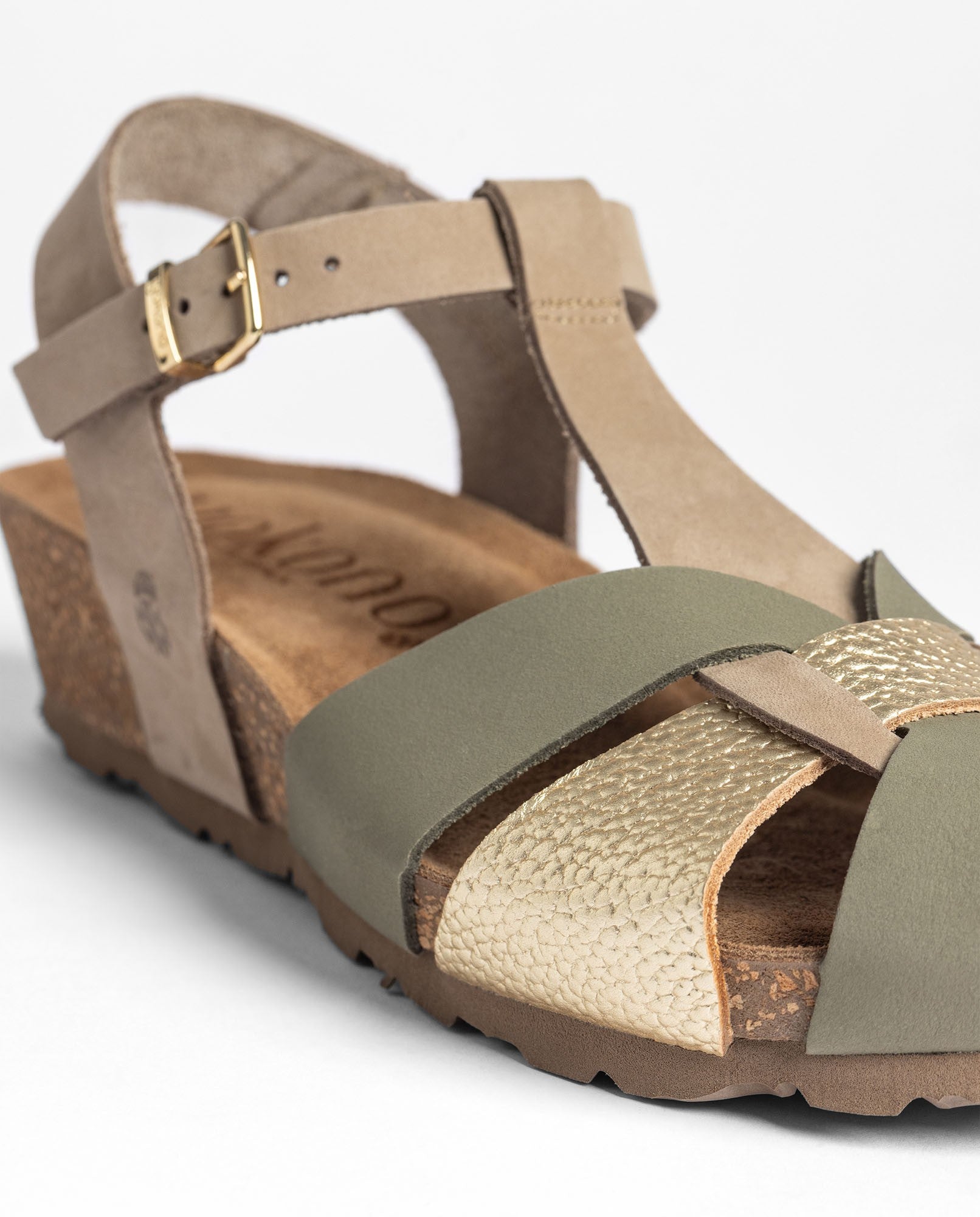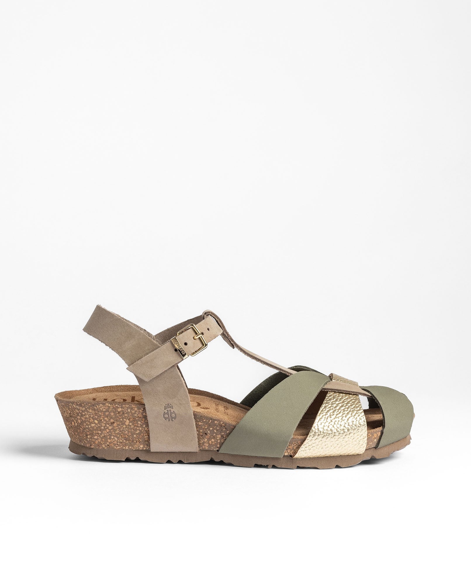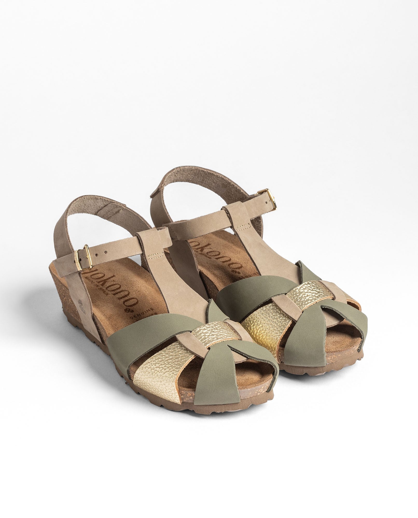 La sandalia de cuña MONACO 260 en color verde está elaborada en piel vacuna y combina tiras en diferentes tonos junto a una pulsera ajustable que asegura una buena sujeción. La plantilla anatómica y la cuña de corcho natural —sostenible y con capacidad para regular la temperatura— ofrecen un confort muy agradable en el día a día. Fabricada con proveedores nacionales, es una opción ligera y versátil que se adapta a muchos estilos.