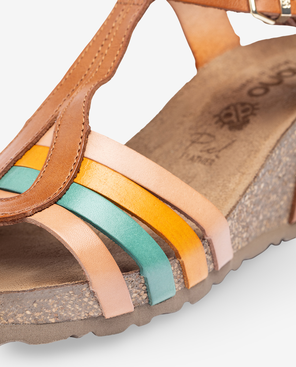 La sandale à semelle compensée CADIZ 301 en marron, avec un design composé de lanières multicolores et une fermeture à boucle qui permet de l'ajuster facilement à votre pied. Il est doté d'un talon compensé de 5,5 cm et d'une semelle intérieure antidérapante qui garantit l'adhérence. Elle est fabriquée à la main en Espagne, avec du cuir et des teintures végétales respectueuses de l'environnement.