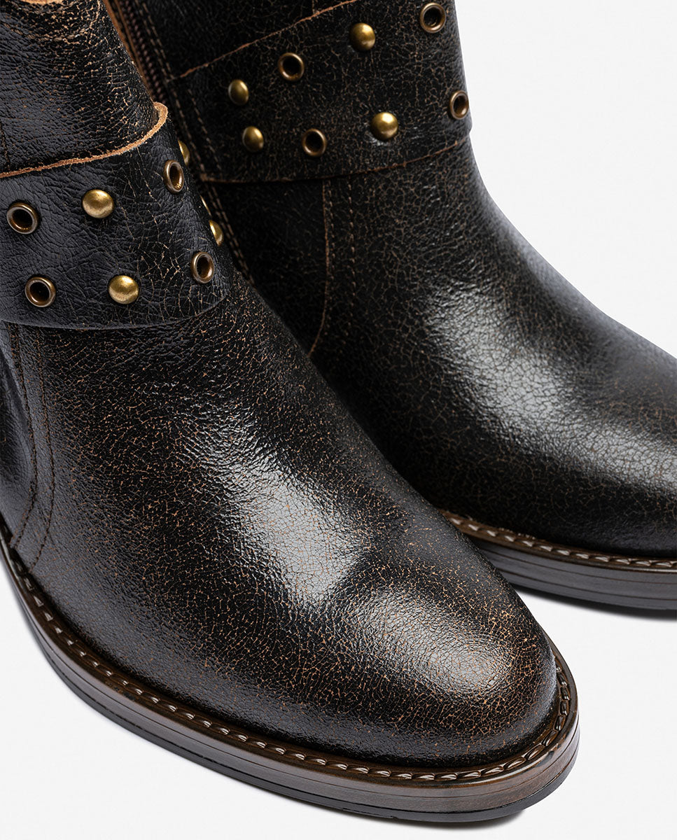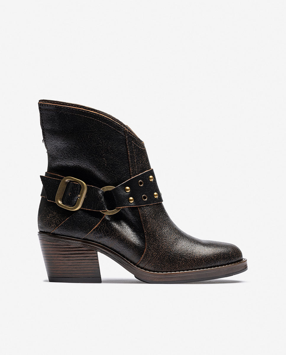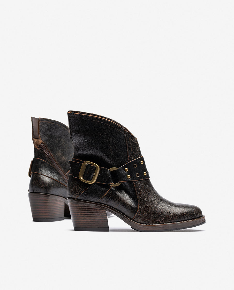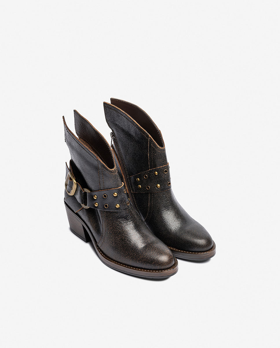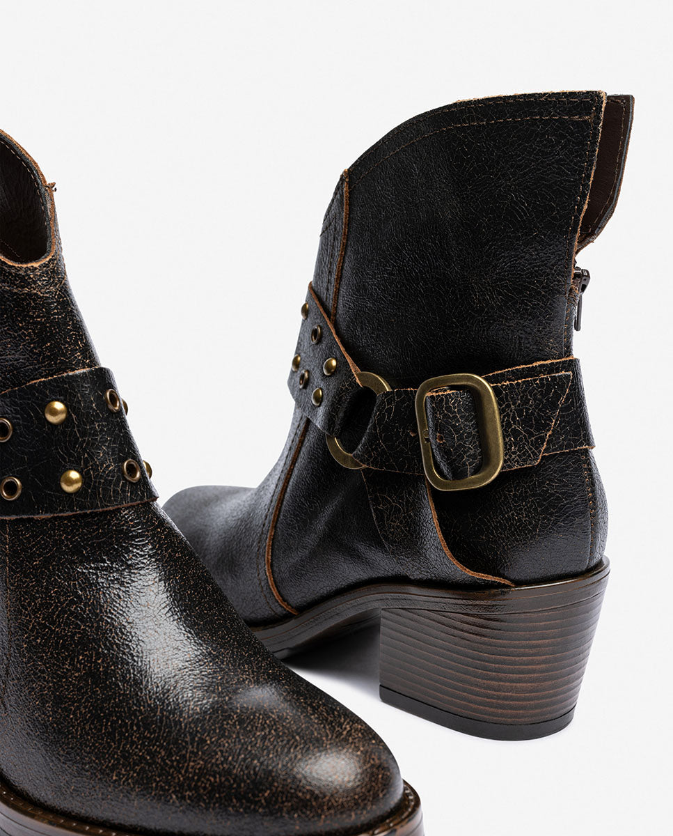 El botín de tacón BRAVA 001 lo tiene todo: carácter, diseño y calidad. Fabricado en piel de alta calidad y con un acabado envejecido que le da personalidad, este modelo de inspiración se convierte en el protagonista de cualquier look. Destaca por su detalle de correa decorativa con tachuelas y hebilla metálica, su punta estilizada y su tacón ancho de 6 cm, que aporta comodidad sin renunciar al estilo.
