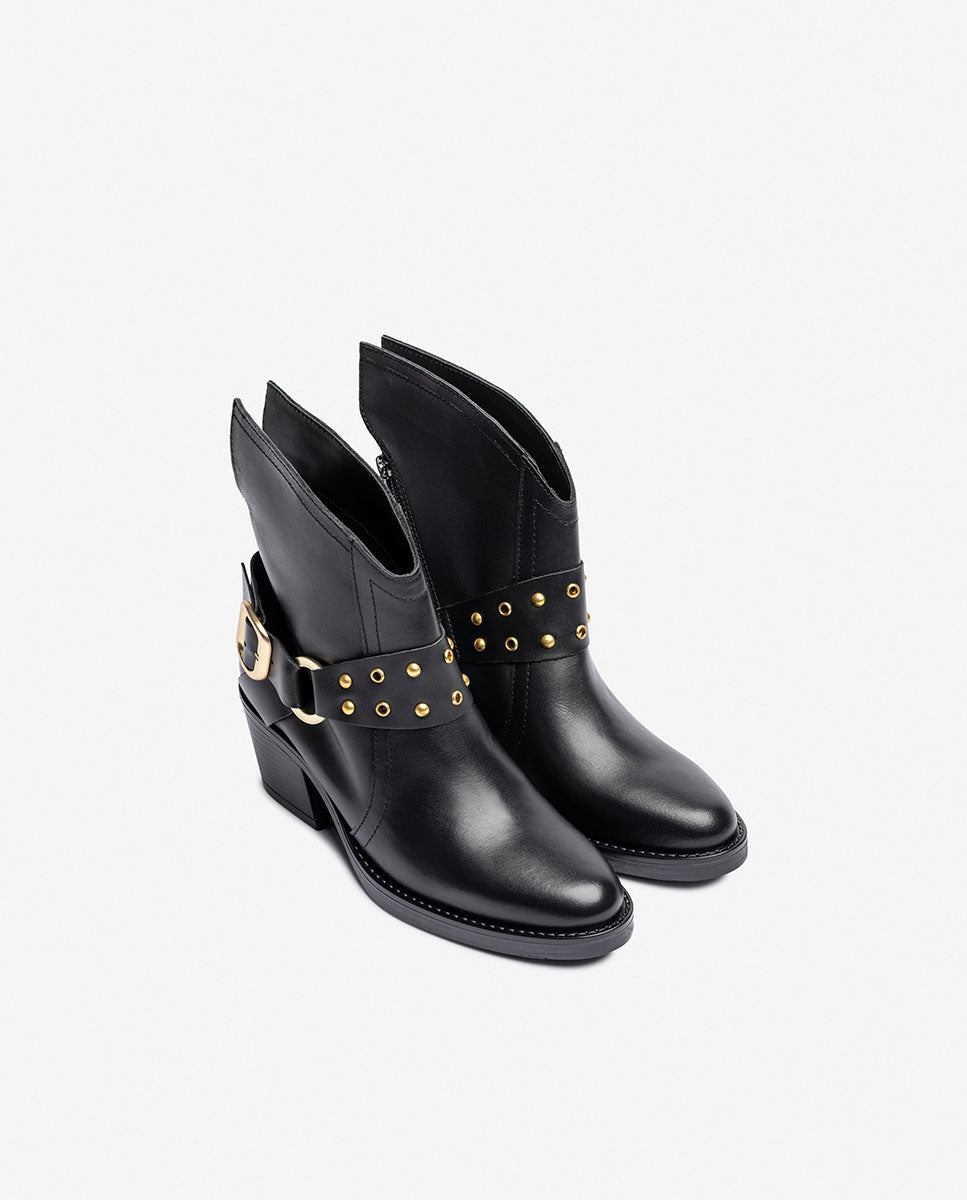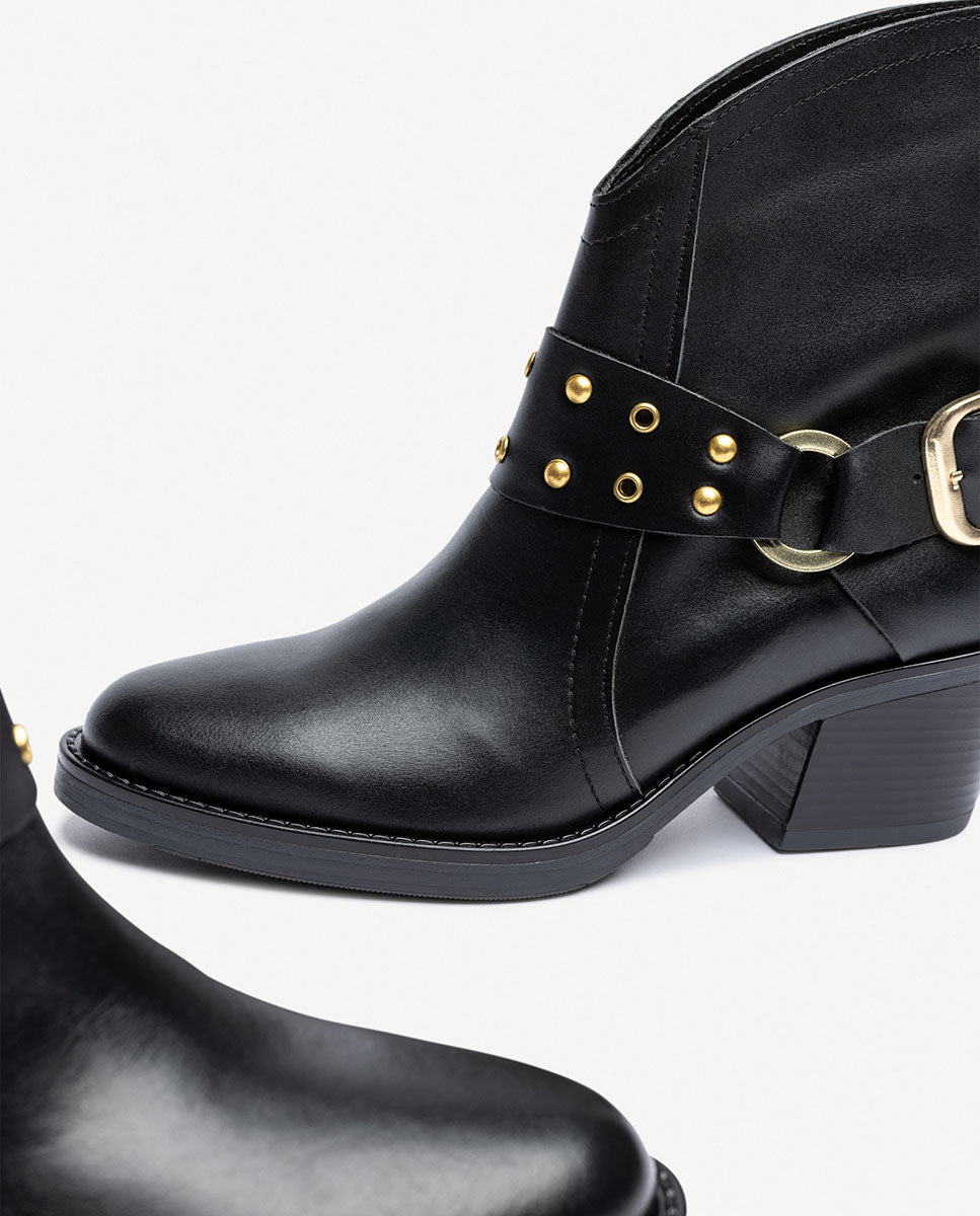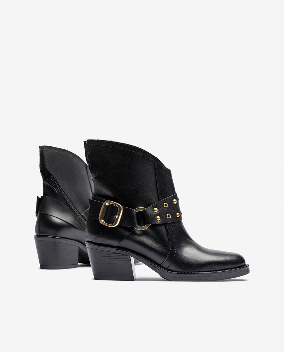 El botín de tacón BRAVA 001 lo tiene todo: carácter, diseño y calidad. Fabricado en piel de alta calidad y con un acabado envejecido que le da personalidad, este modelo de inspiración se convierte en el protagonista de cualquier look. Destaca por su detalle de correa decorativa con tachuelas y hebilla metálica, su punta estilizada y su tacón ancho de 6 cm, que aporta comodidad sin renunciar al estilo.