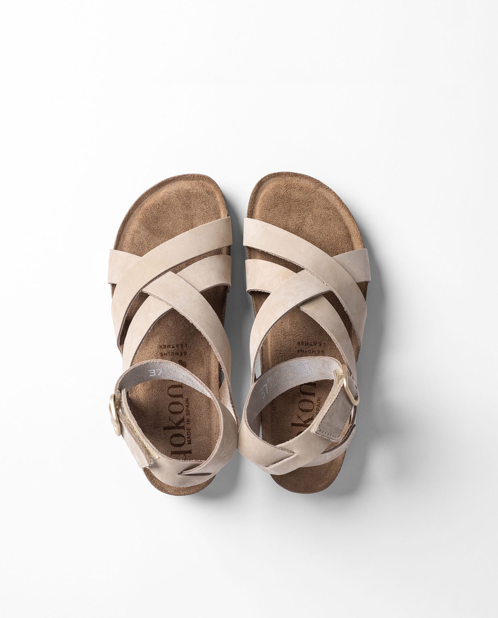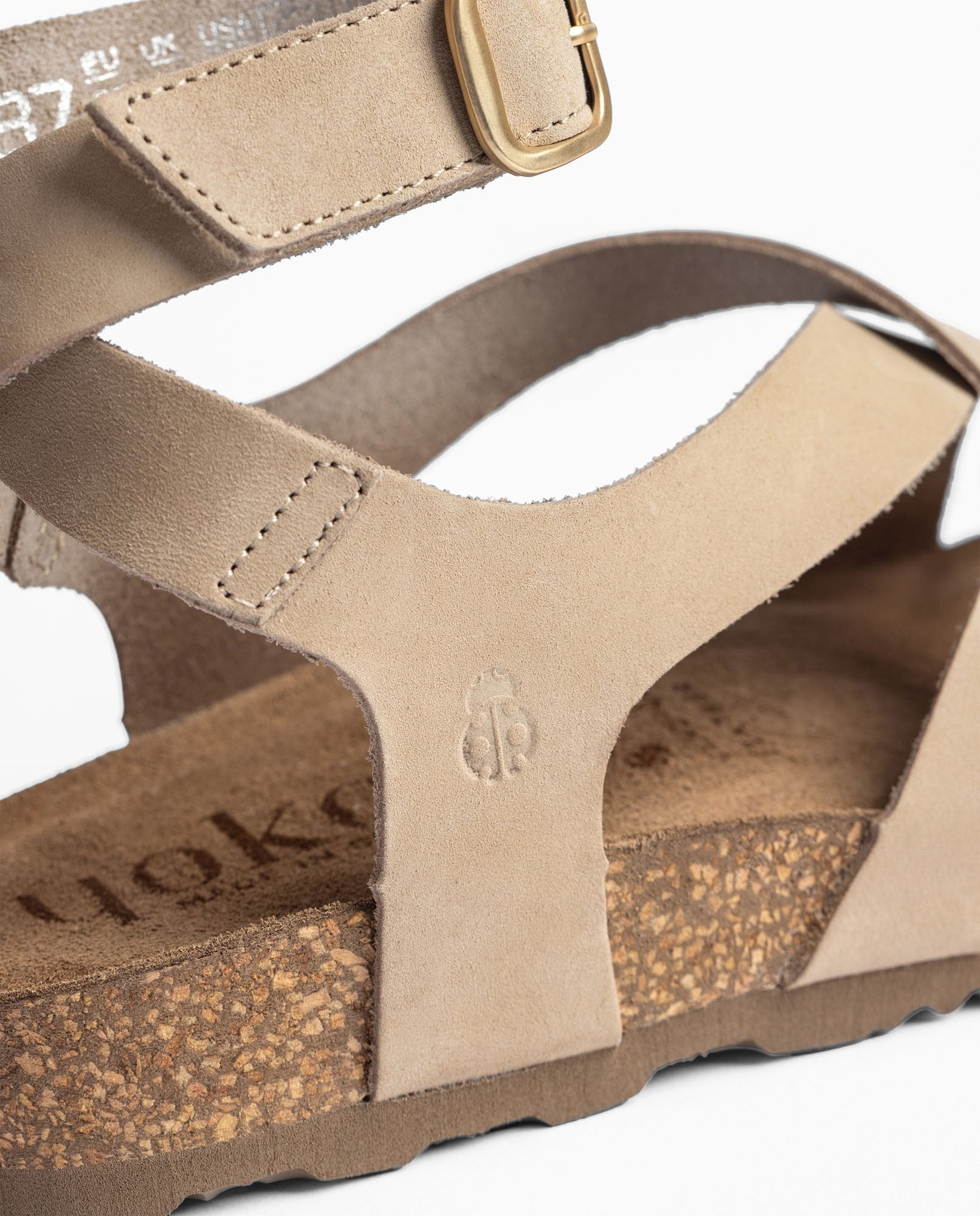 La sandalia plana JERBA 261 en color beige está elaborada en piel vacuna de alta calidad y combina tiras cruzadas con una pulsera ajustable al tobillo, ofreciendo una buena sujeción y un estilo más cuidado. Su plantilla anatómica garantiza comodidad en cada paso, mientras que el piso de corcho natural sostenible, con propiedades de regulación térmica, aporta ligereza y bienestar durante toda la jornada. Fabricada con proveedores nacionales, es una sandalia de calidad, cómoda y con un look versátil pensado para acompañarte en el día a día.